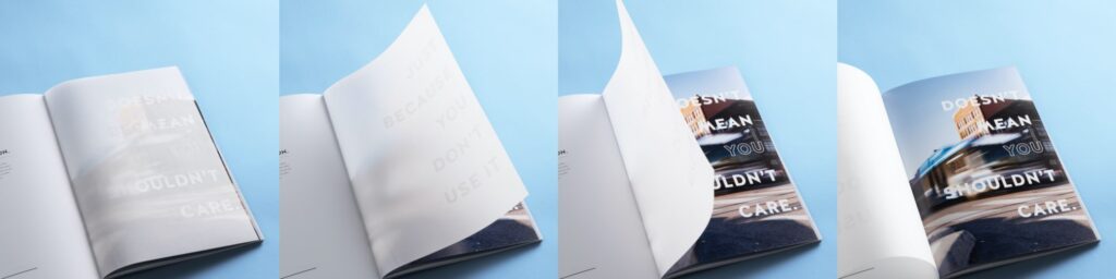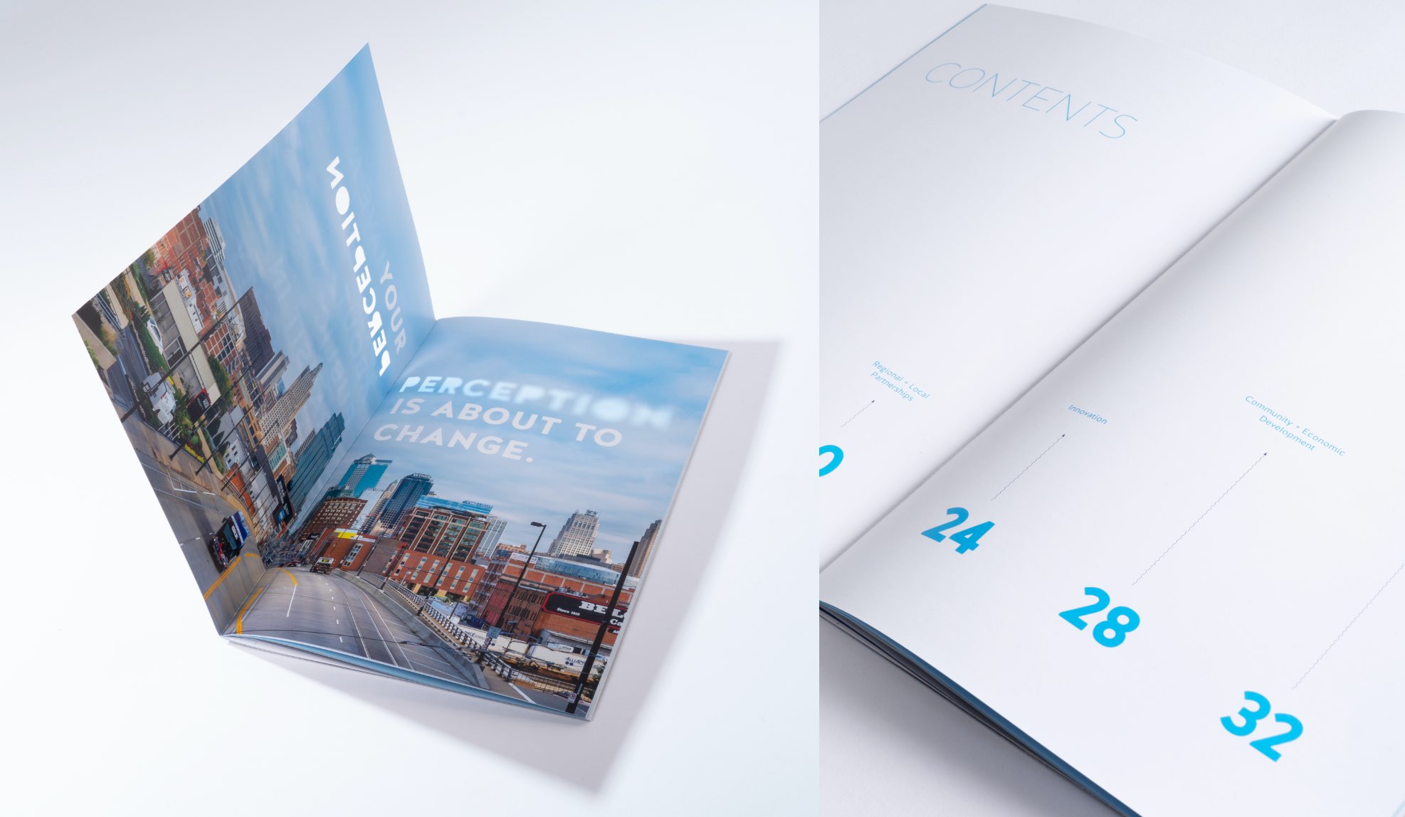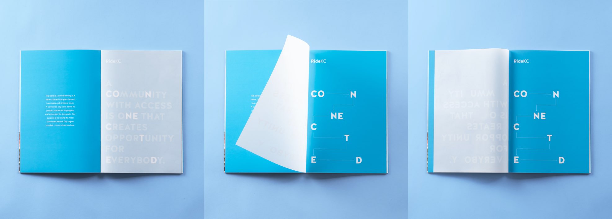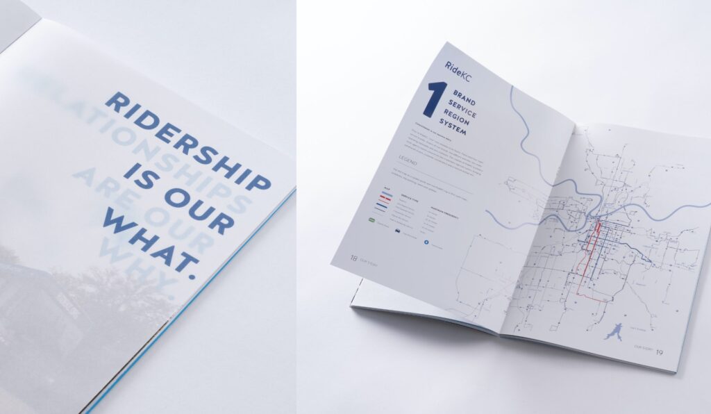 The Kansas City Transportation Authority (KCATA) faced an obstacle: How do we inform our audience—a group who considers us irrelevant—that we are crucial to the growth of Kansas City? In efforts to combat this truth, we aligned a multi-use collateral piece to the concept, “changing perception.” From utilizing die-cut on the front cover to bold headlines that interact with vellum sheets, we represent moments of clarity through copy and design.